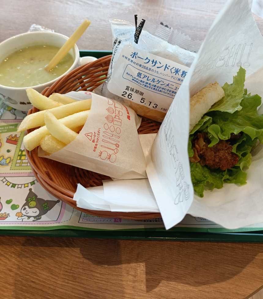 • 低アレルゲンメニューは初めてで、果たして美味しいのか?と半信半疑だったが、米粉バンズはもっちもちで美味しいし、中のポークは塩加減が優しくぷりっとジューシーで美味しかった!