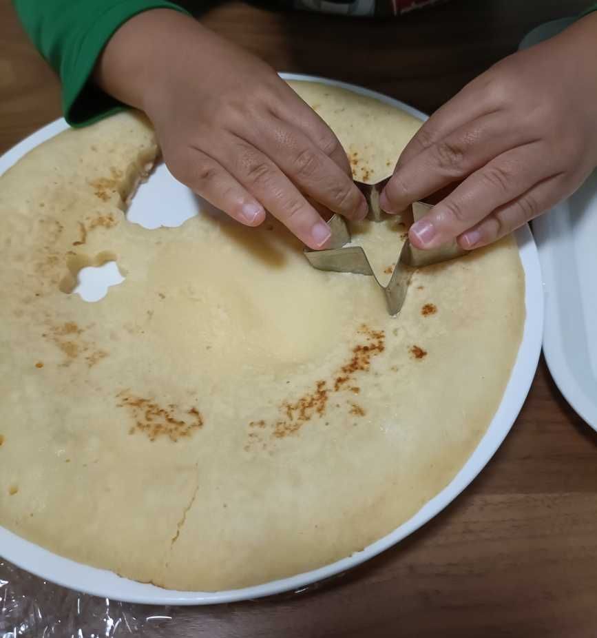私は小さな綺麗な丸形に焼くのが苦手なので、フライパン型で一気に焼いて、冷めてから子どもと型抜きして楽しんでます。